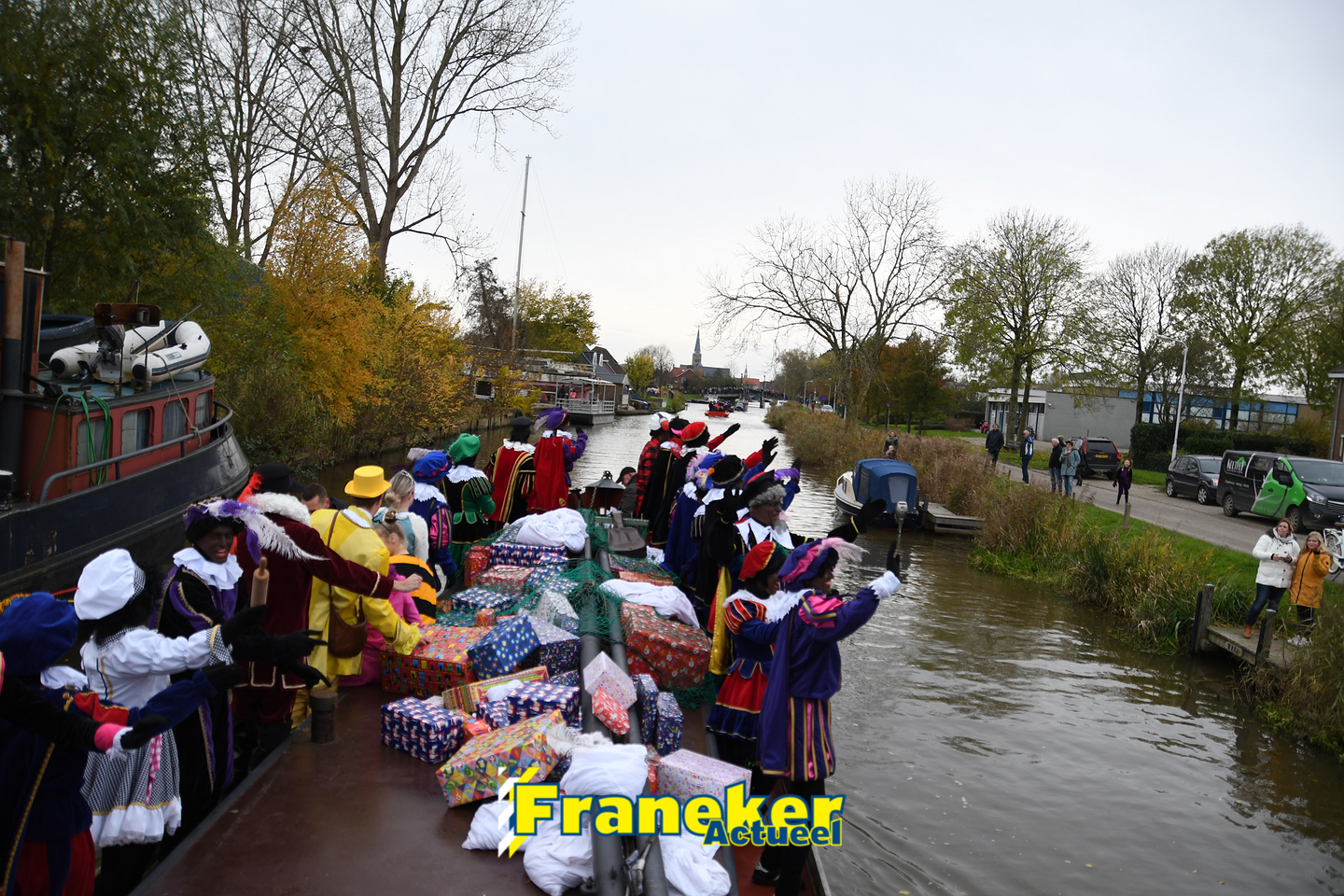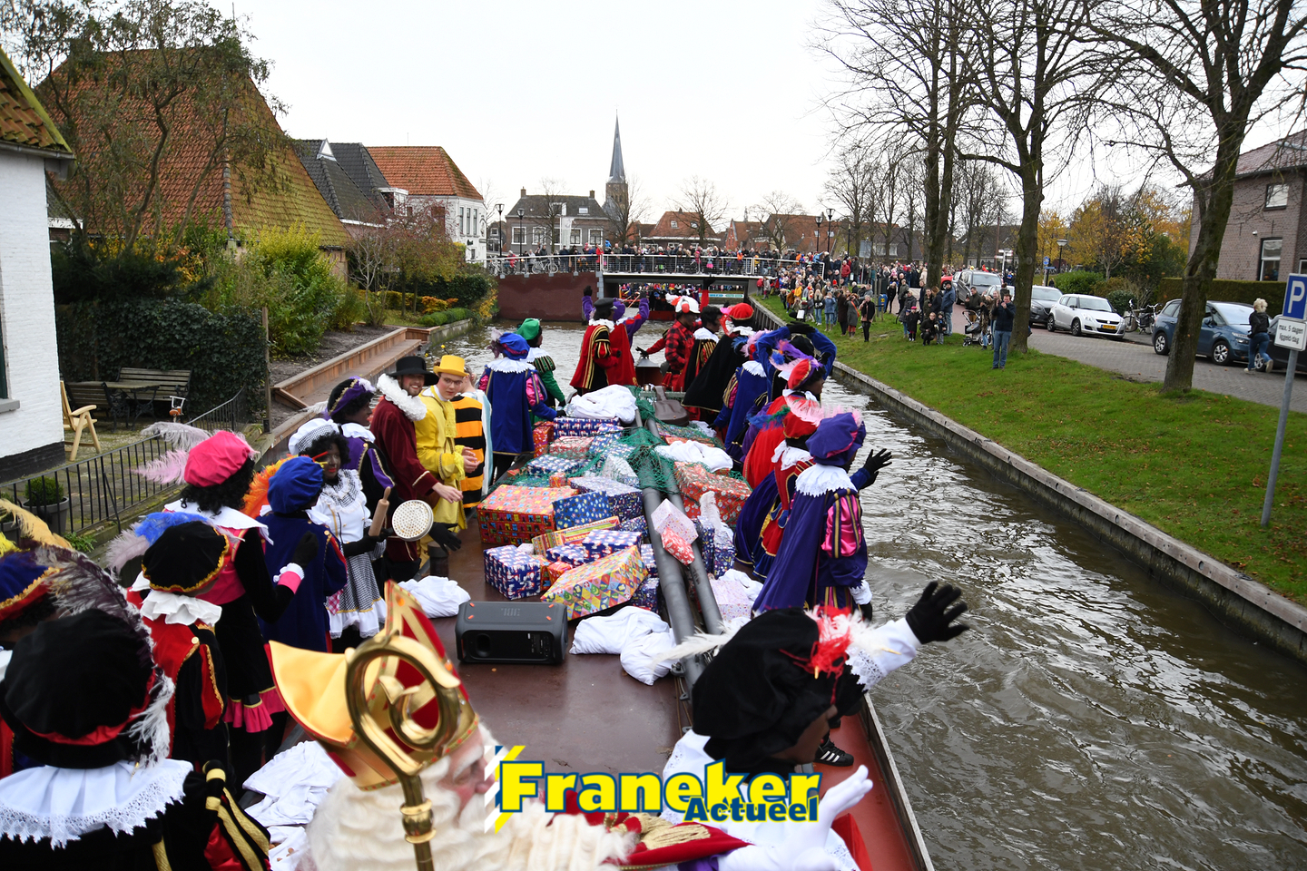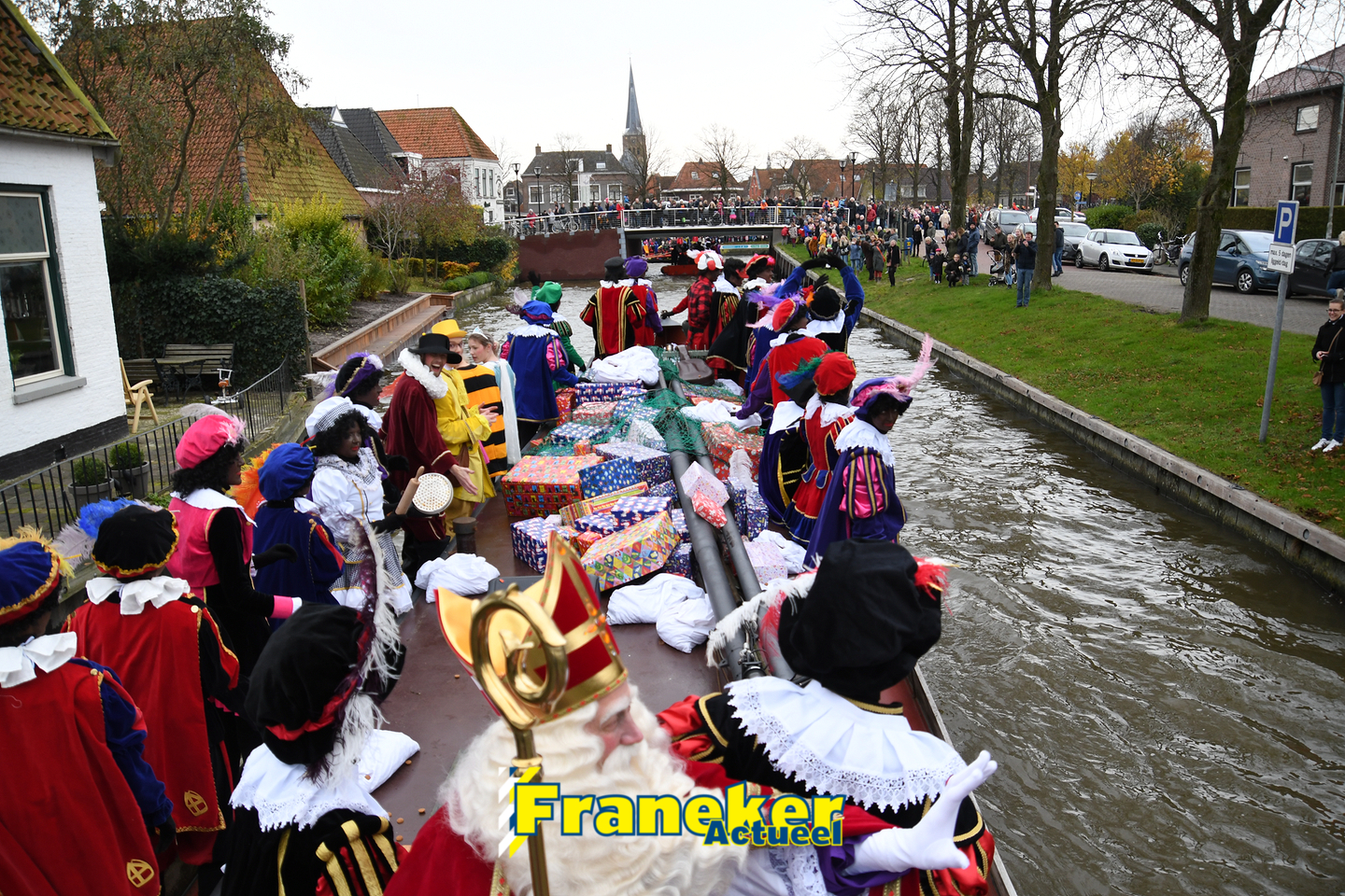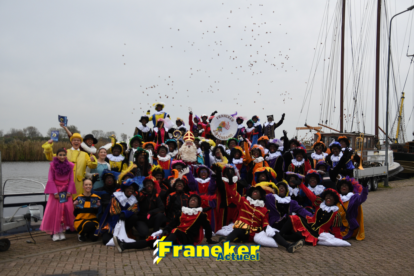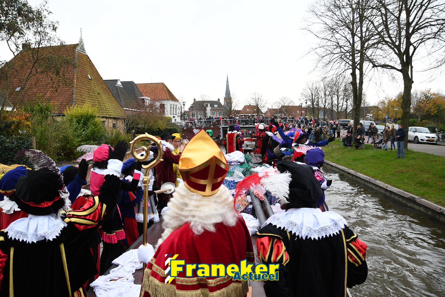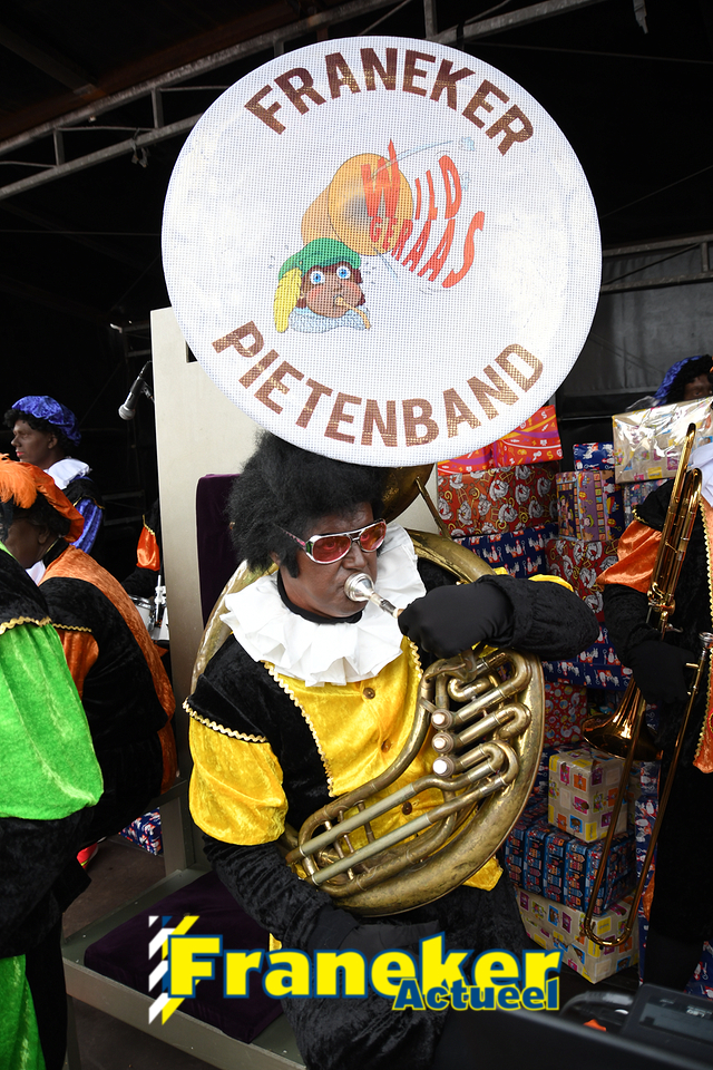 Onder gelukkig droge weersomstandigheden kwam de Sint met drie boten vol met cadeaus en zijn traditionele zwarte Pieten weer aan in Franeker en werd er voet aan wal gezet aan de Turfkade en werd er volop feest gevierd met de Franeker Pietenband “Wild Geraas”