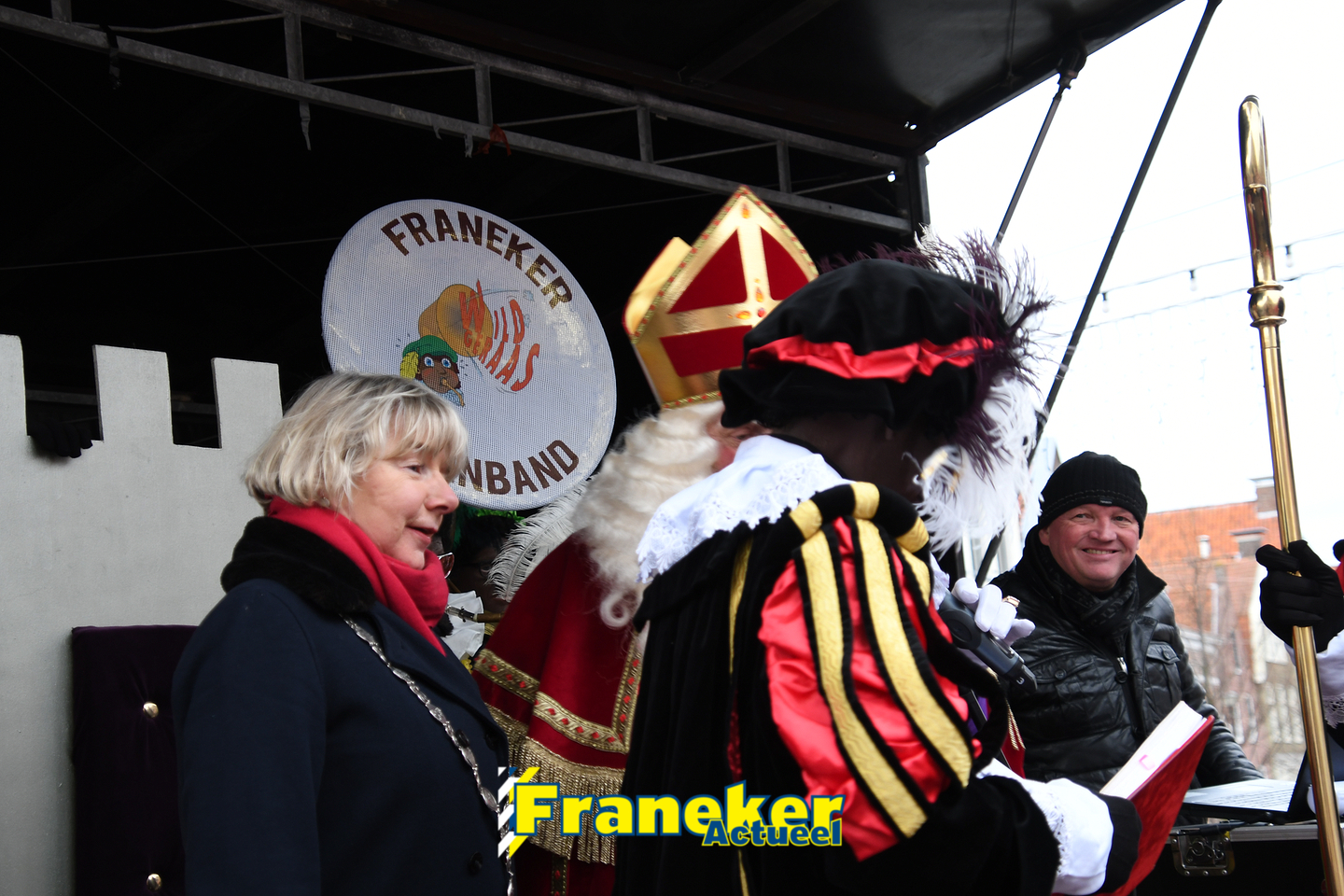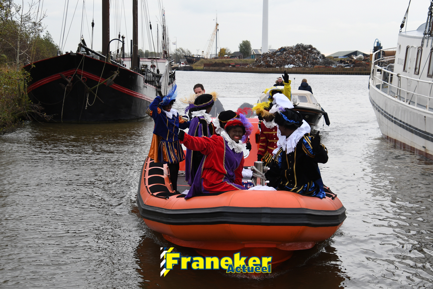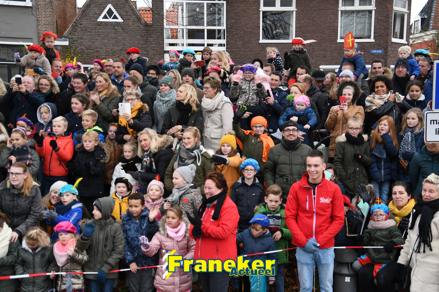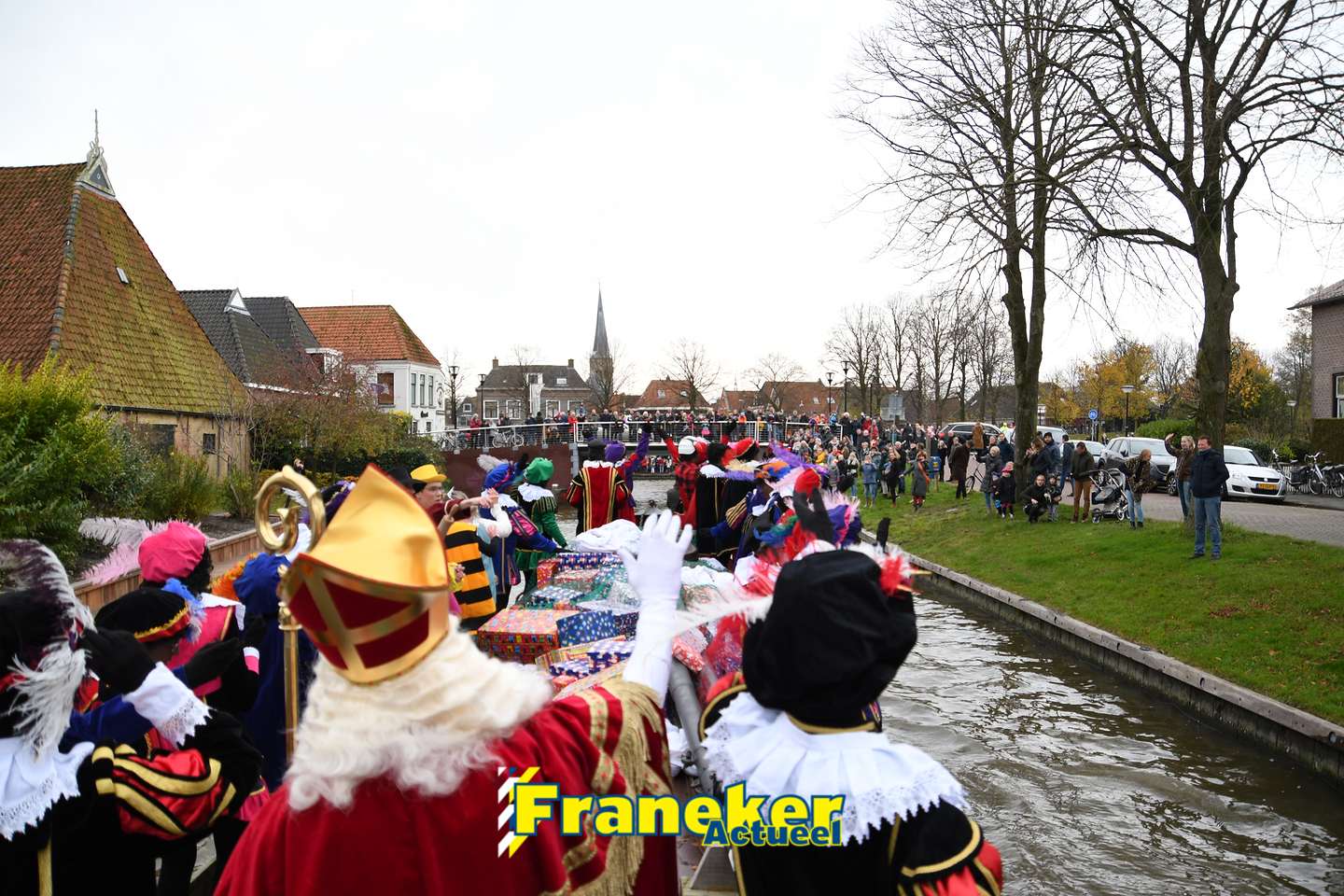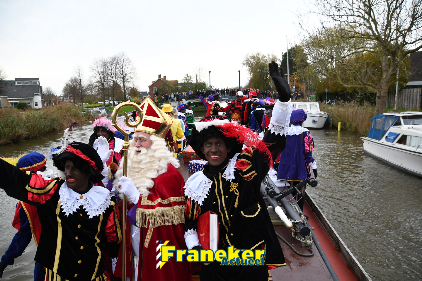 Onder gelukkig droge weersomstandigheden kwam de Sint met drie boten vol met cadeaus en zijn traditionele zwarte Pieten weer aan in Franeker en werd er voet aan wal gezet aan de Turfkade en werd er volop feest gevierd met de Franeker Pietenband “Wild Geraas”