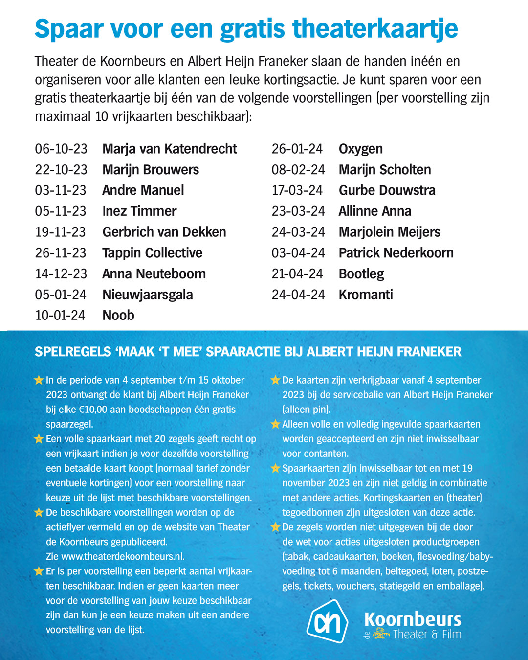 De beschikbare voorstellingen zijn terug te vinden op de website www.theaterdekoornbeurs.nl/nieuws. Ook liggen er bij de theaterkassa en bij de kassa’s van Albert Heijn Franeker informatieflyers. De theaterkaarten zijn verkrijgbaar bij de servicebalie van AH Franeker. Volle spaarkaarten zijn tot en met 19 november 2023 te verzilveren en zijn niet geldig in combinatie met andere acties en/of kortingskaarten