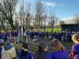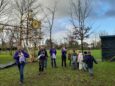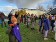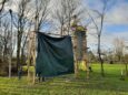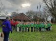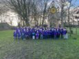 Na afloop verzamelden alle leden, ouders en andere belangstellenden zich bij het ingepakte Jubileumbouwwerk. Toen het doek wegviel bleken in de toren allemaal tasjes te hangen. Tot hun verrassing kregen alle leden een mooi jubileum t-shirt. Met de shirts over de scoutingbloezen werd een uitgelaten groepsfoto gemaakt voor het Jubileumbouwwerk. De kop is er af. In april feesten we verder met een Open Dag voor omwonenden en bedrijven, in september een Jubileumkamp en tot slot een Reünie op 1 november 2025.