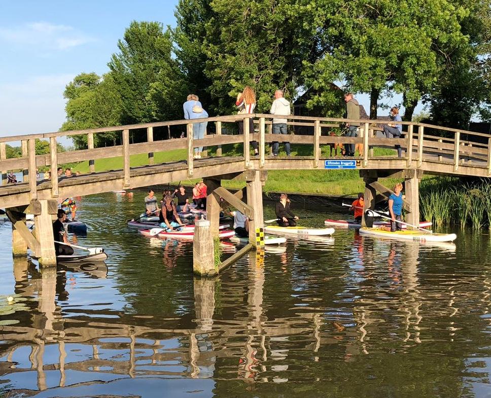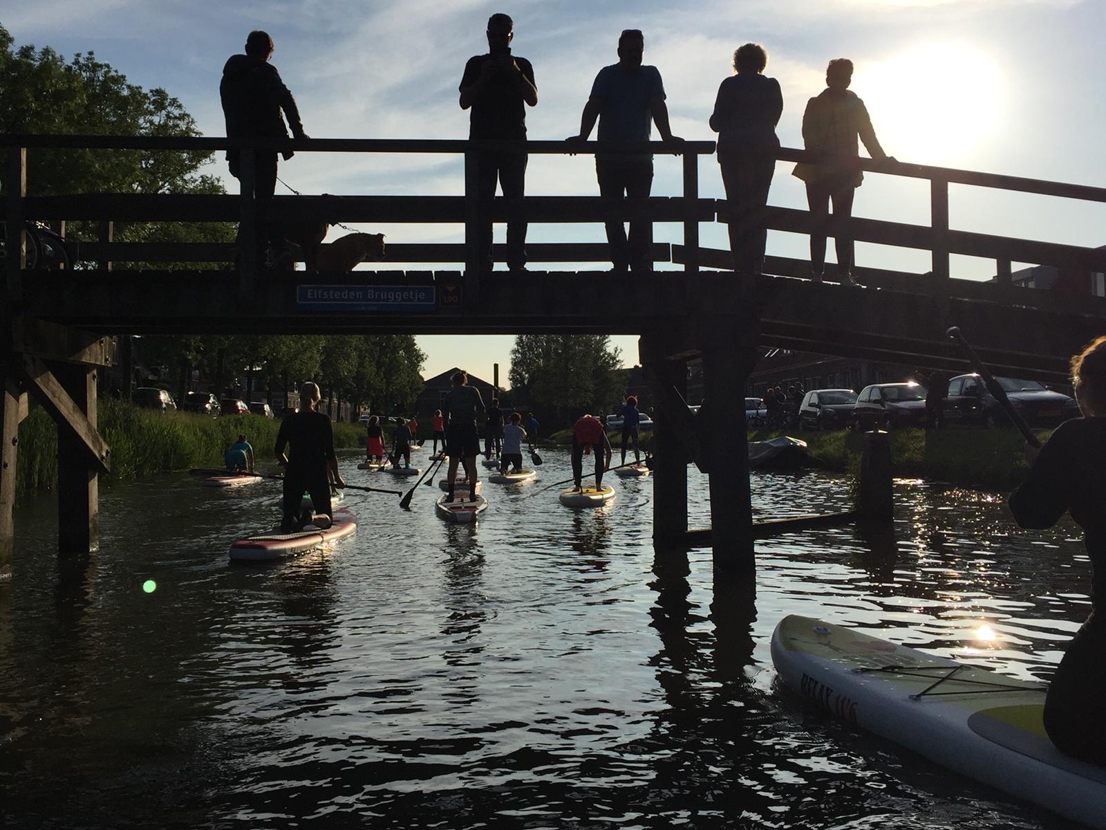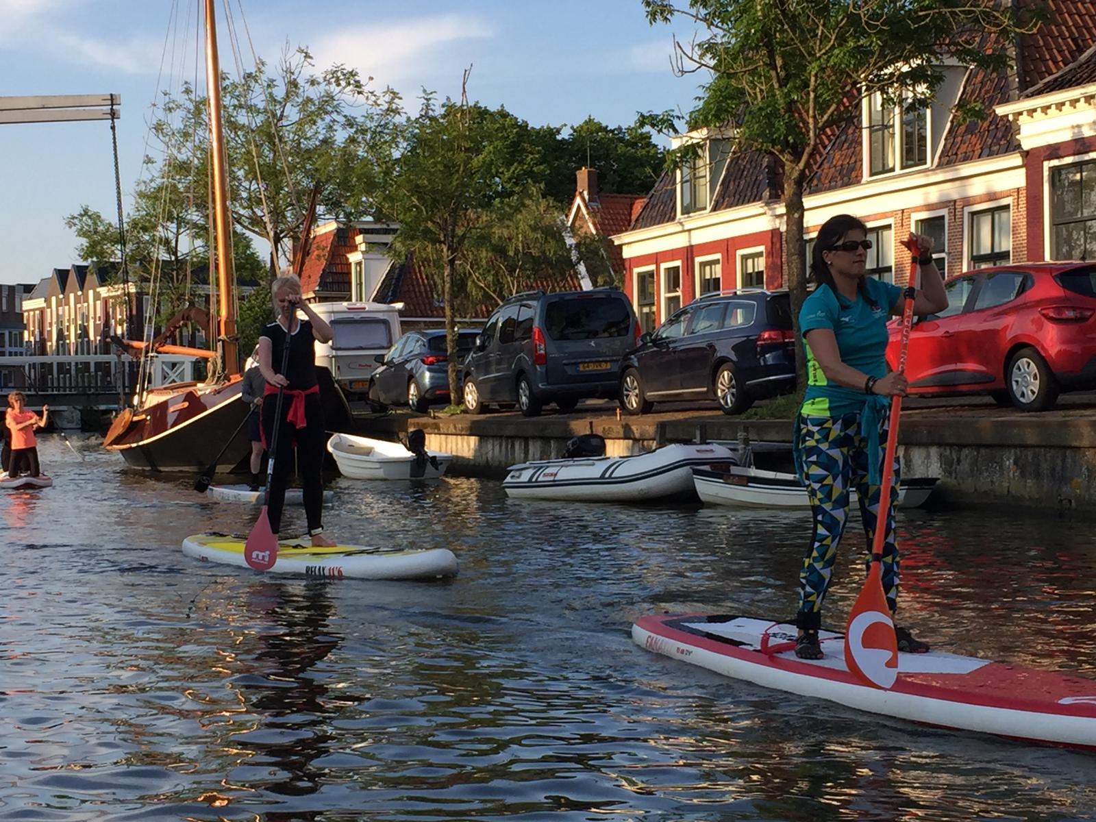 De 25 deelnemers kregen eerst uitleg op het droge, hoe te peddelen en goed te staan op de plank. Voor eigenlijk alle deelnemers was het de eerste keer. Al snel werd er op het water gestart, en na een stukje op de knieen, stonden de meeste mensen al na het 11-stedenbruggetje op hun plank. En werd de route gevaren die Maarten volgende week in Franeker gaat zwemmen.