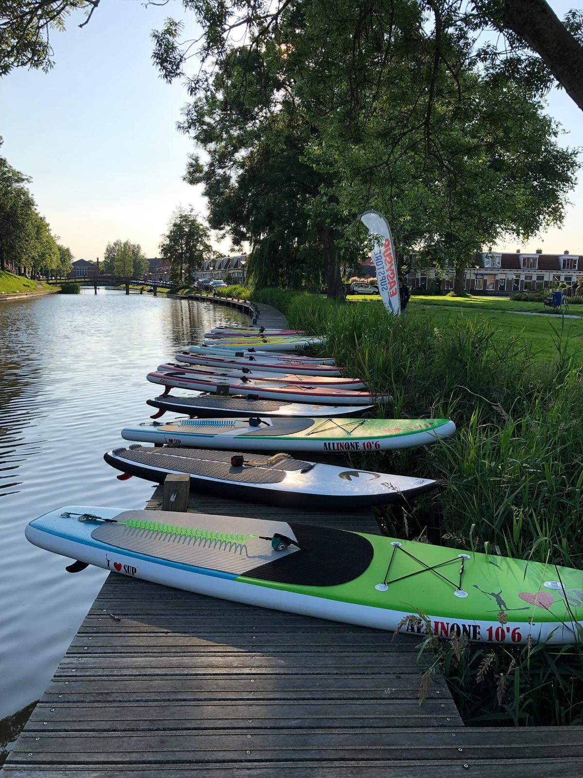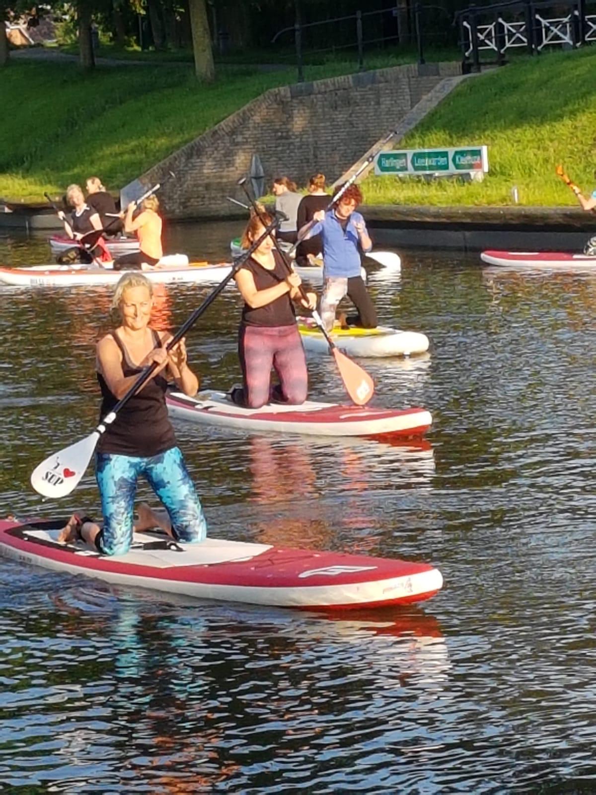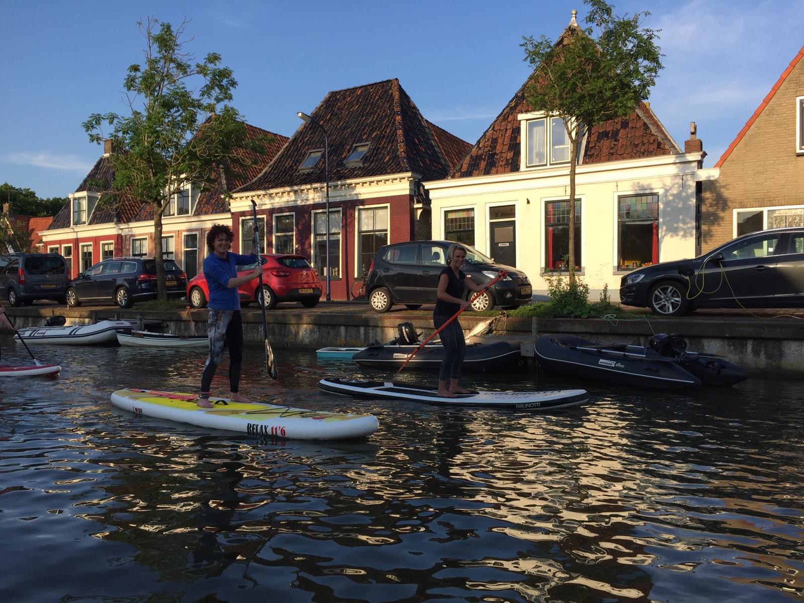 De 25 deelnemers kregen eerst uitleg op het droge, hoe te peddelen en goed te staan op de plank. Voor eigenlijk alle deelnemers was het de eerste keer. Al snel werd er op het water gestart, en na een stukje op de knieen, stonden de meeste mensen al na het 11-stedenbruggetje op hun plank. En werd de route gevaren die Maarten volgende week in Franeker gaat zwemmen.