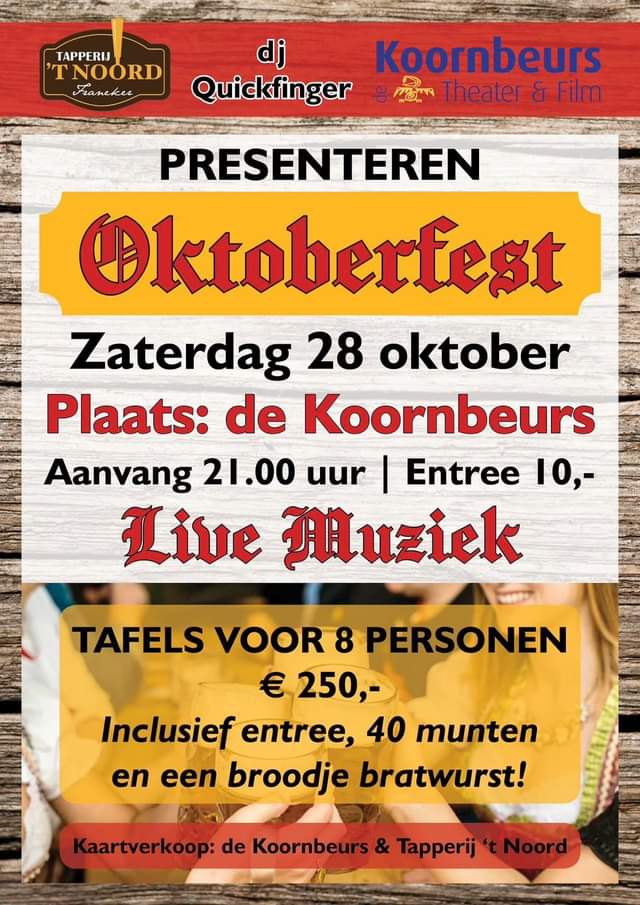 Op 28 oktober organiseert Tapperij ’t Noord samen met de Koornbeurs ‘Oktoberfest’. Met live muziek van Dutch Helene Fischer, Top 100 band en misschien wel de zingende barman Cor de GROOT. DJ Quickfinger brengt de avond tot het hoogtepunt. Voor kaarten kun je terecht bij de Tapperij of de Koornbeurs. Hier moet je bij zijn!