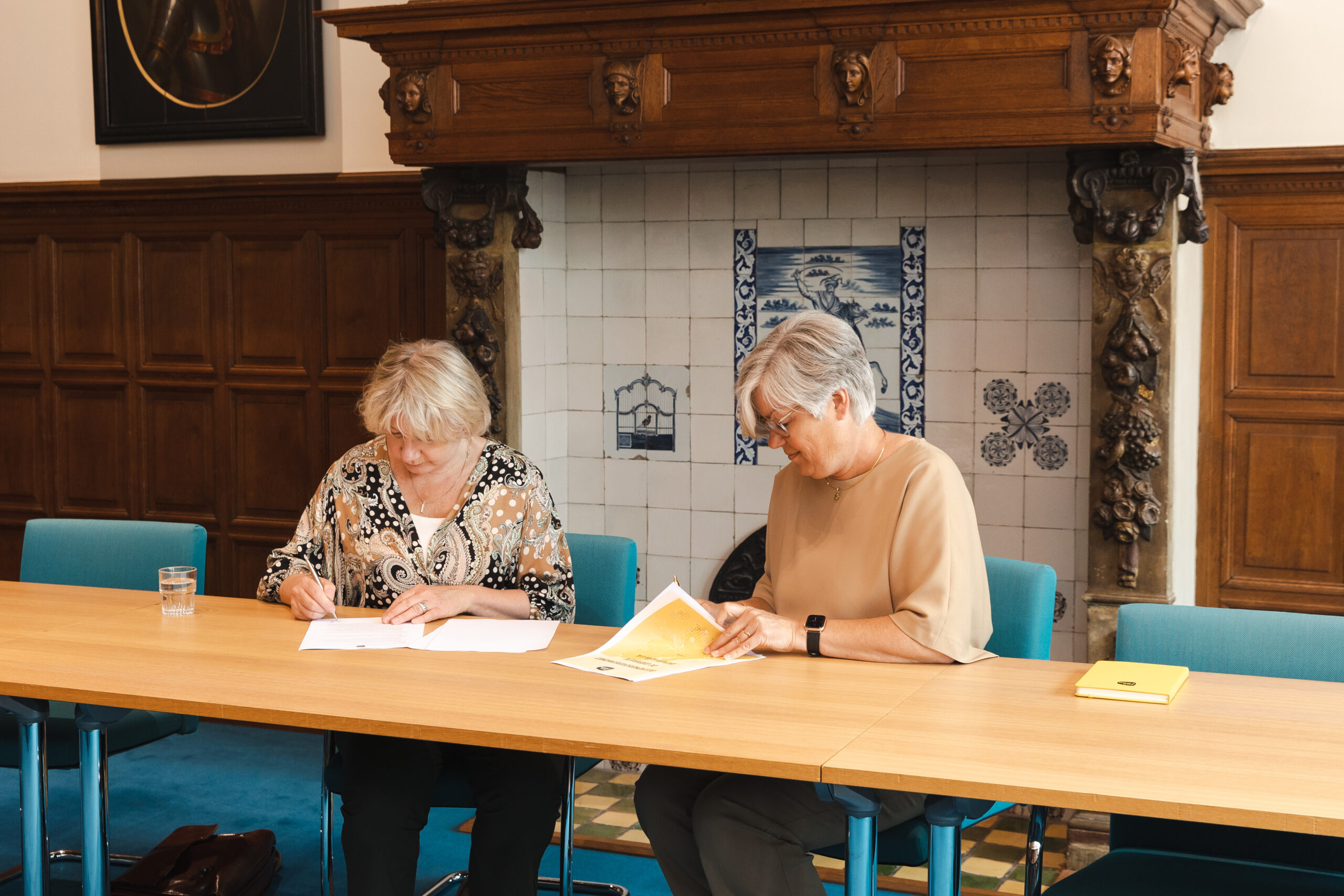 Ondertekening toetreding Coöperatie DataFryslân door Marga Waanders (Gemeente Waadhoeke) en Regina Bouius (Provincie Fryslân
