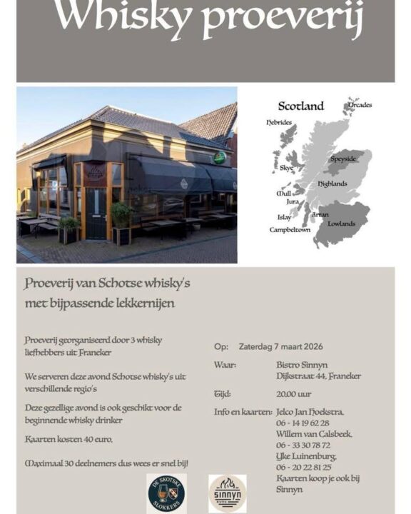 Op zaterdag 7 maart 2026 organiseren drie gepassioneerde whiskyliefhebbers uit Franeker een bijzondere whiskyproeverij bij Bistro Sinnyn aan de Dijkstraat 44. Tijdens deze avond staan Schotse whisky’s uit verschillende regio’s centraal, zorgvuldig geselecteerd en gecombineerd met bijpassende lekkernijen.