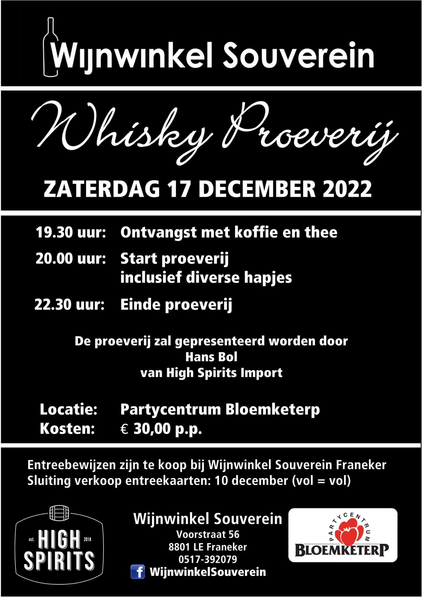 Op Zaterdag 17 December a.s. wordt in samenwerking met High Spirits Import met gastspreker Hans Bol door Wijnwinkel Souverein in Franeker, een Whiskyproeverij gehouden, deze zal plaats vinden in de benedenzaal van restaurant Bloemketerp. (lift aanwezig)