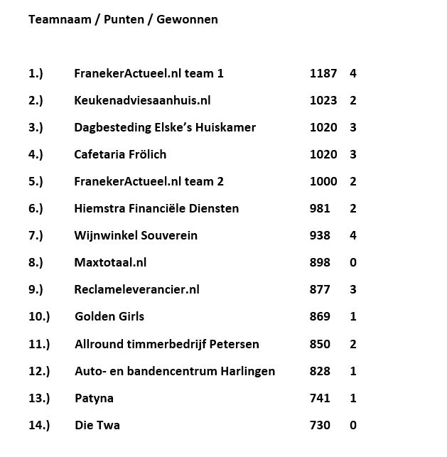 Dinsdag 16 oktober is de volgende speelronde en staat er o.a. de wedstrijd tussen de twee ongeslagen teams op het programma en gaan we kijken of de teams van Maxtotaal.nl en Die Twa van de hatelijke 0 overwinningen kunnen afkomen.