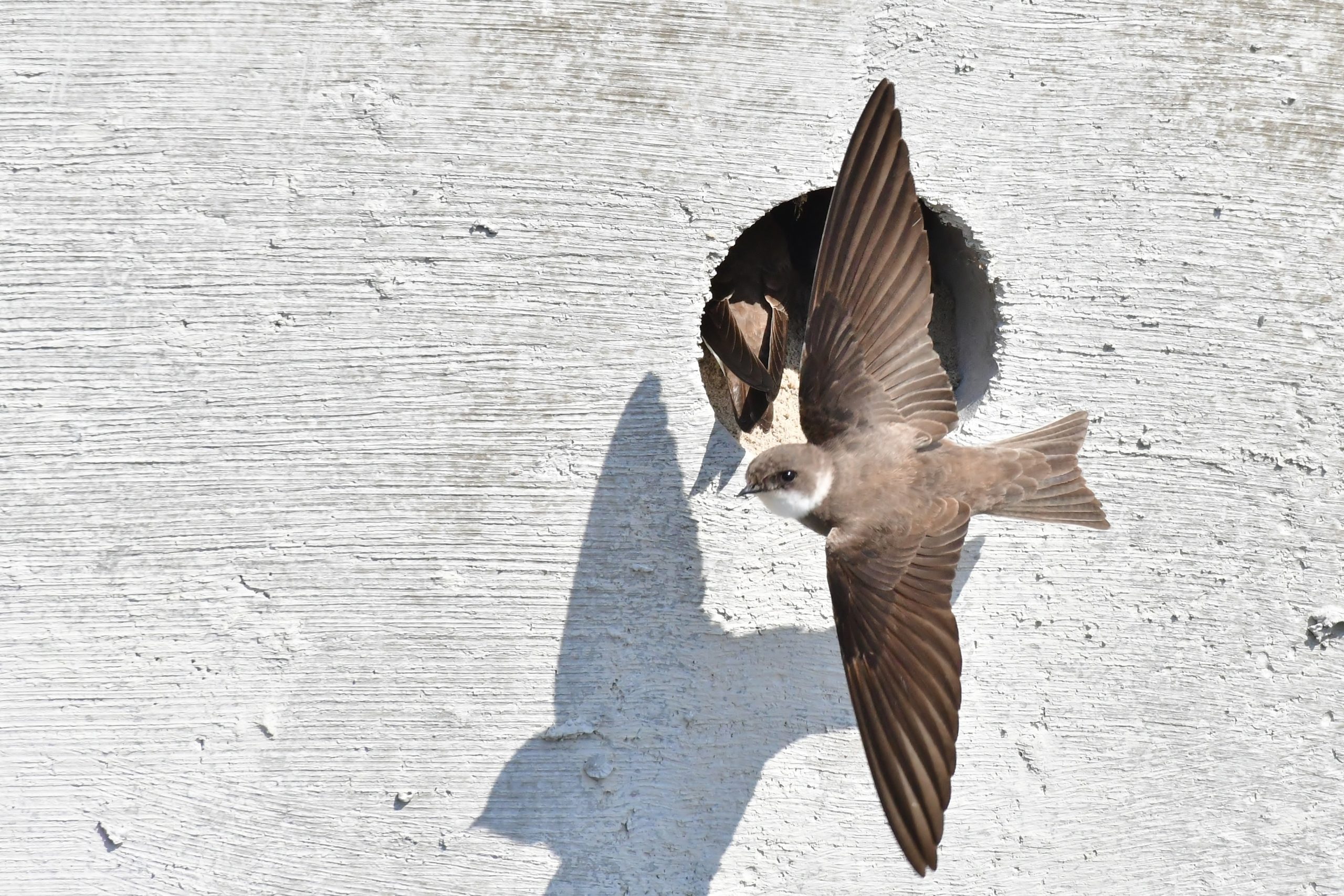 Hier zijn 3 gegadigden een minimum, vaker staan er 10 op de stoep. Bij de zwaluwmuur lijkt de situatie opgelost. Het wachten is op het jonge kroost, dan krijgen de ouders het druk met voederen en zijn 3 bekjes voor de ingang een goed en vrolijk gezicht. De zwaluwmuur staat aan de noordzijde van Oosterbierum aan de Konkelswei.