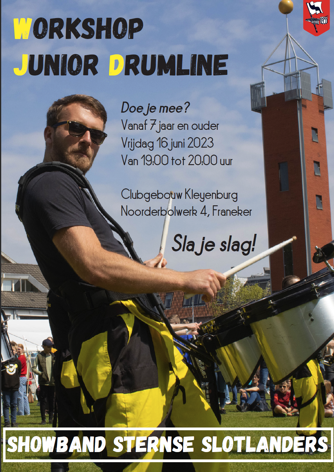 De Sternse Slotlanders uit Franeker willen het concept drumline ook toegankelijk maken voor kinderen vanaf 7 jaar. Hiervoor wordt op vrijdag 16 juni 2023 een Workshop Junior Drumline georganiseerd in het Clubgebouw Kleyenburg (Noorderbolwerk 4 te Franeker) van 19:00 tot 20:00.