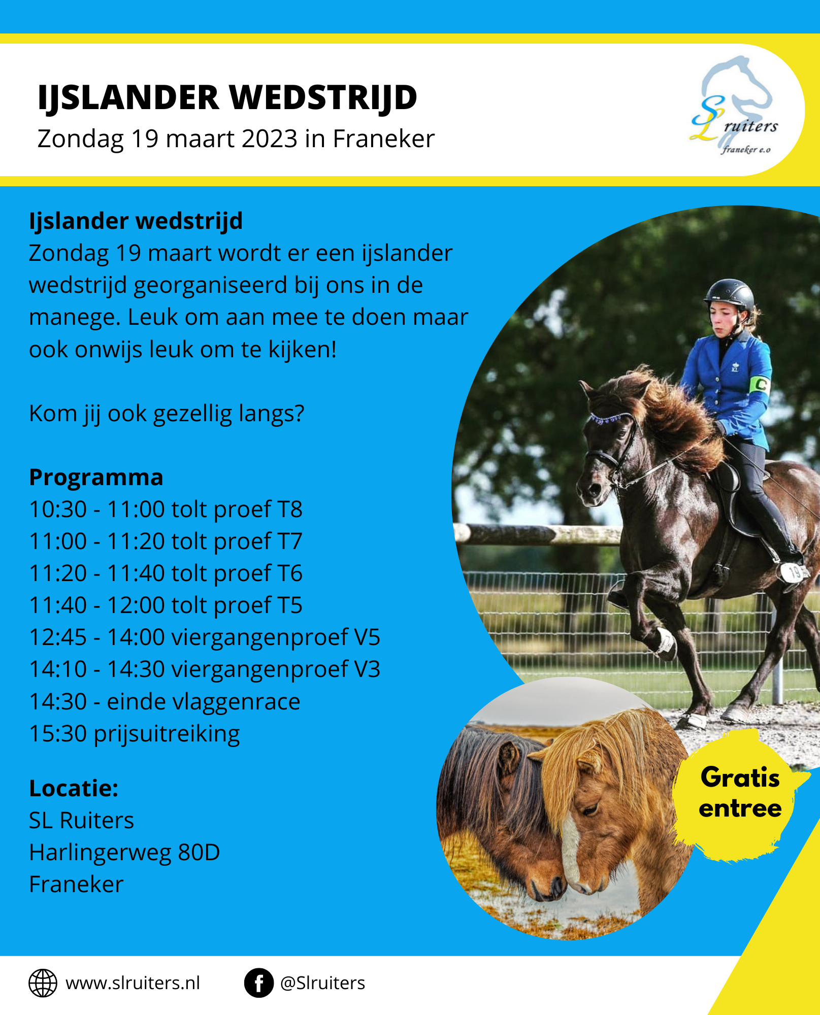 Aankomende zondag 19 maart is het zover! De allereerste grote Fra Neisti Indoorwedstrijd samen met de Sjaerdema-Liauckemaruiters Franeker. Het beloofd een prachtige wedstrijd te worden met ongeveer 35 ruiters op hun IJslander. Een hele dag lang wordt de manege ondergedompeld in één en al IJslander! Er is een leuke stand van Westeind Zadelmakerij en ook de Welkoop Franeker is aanwezig.