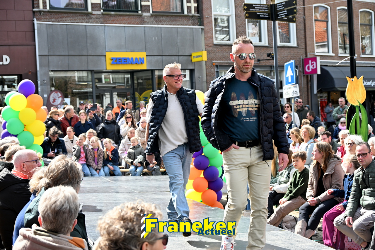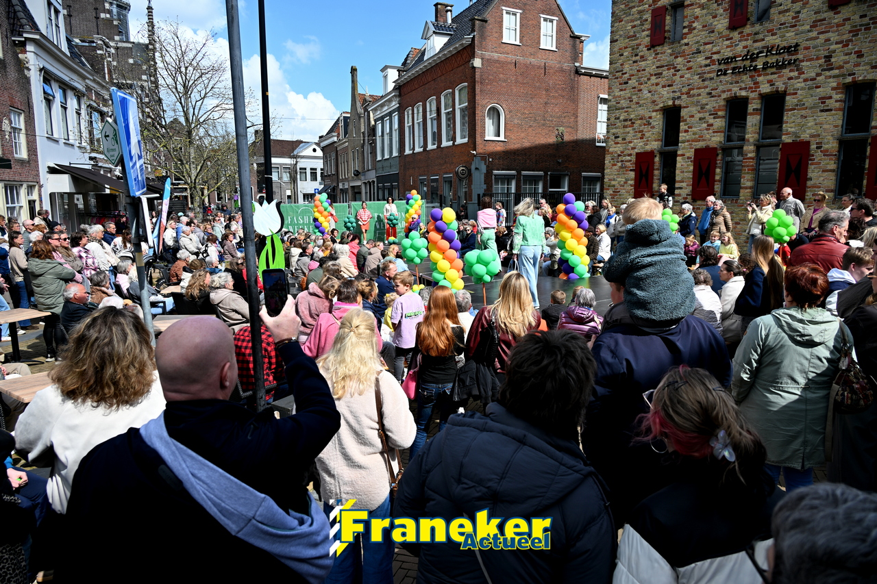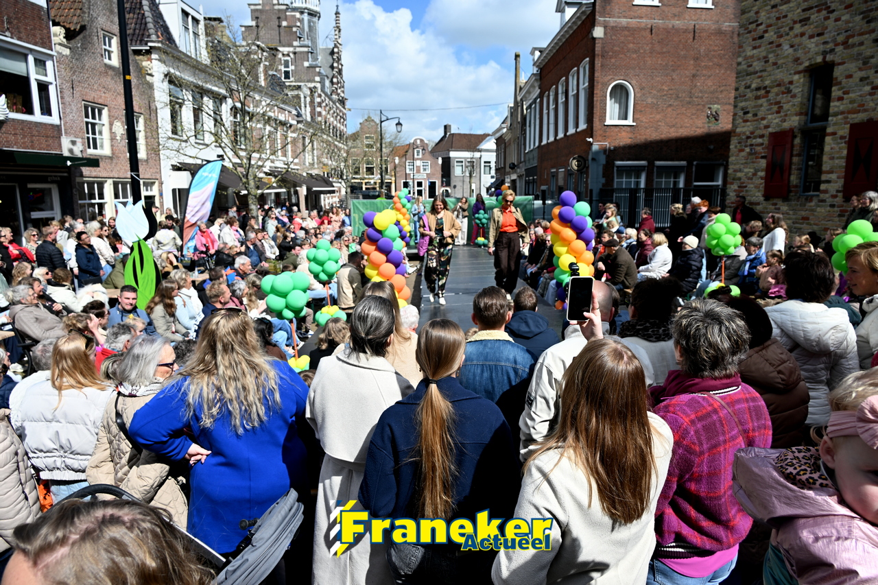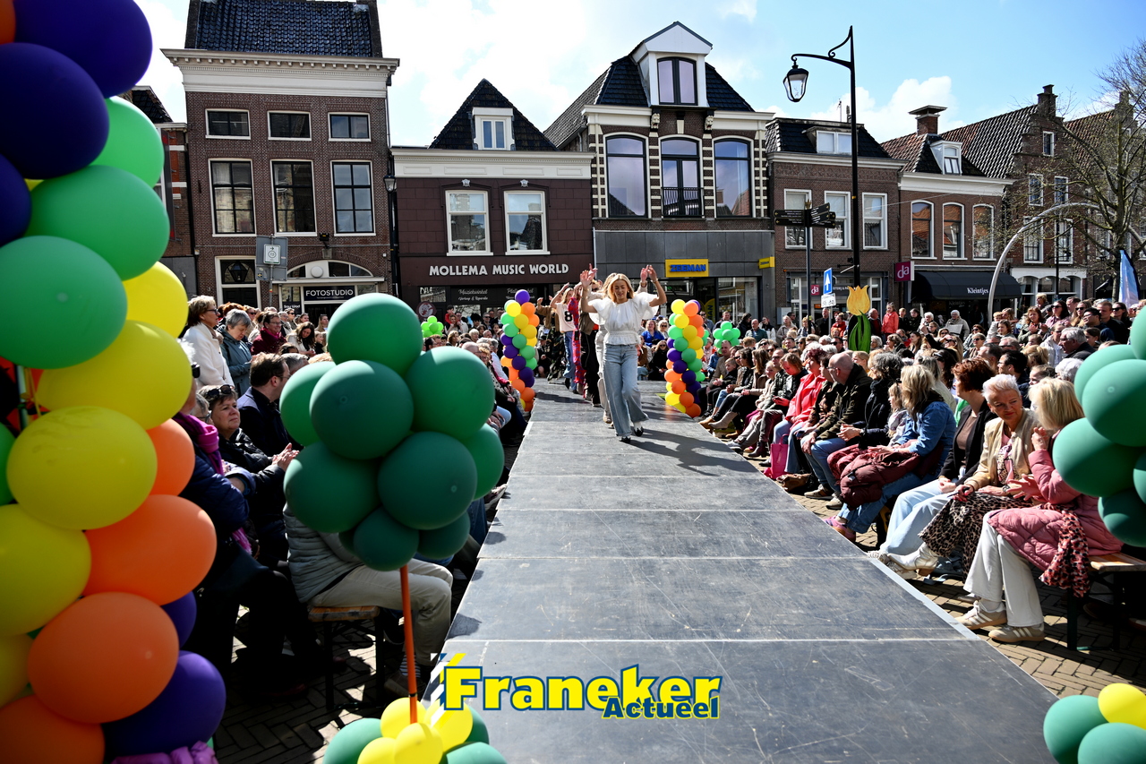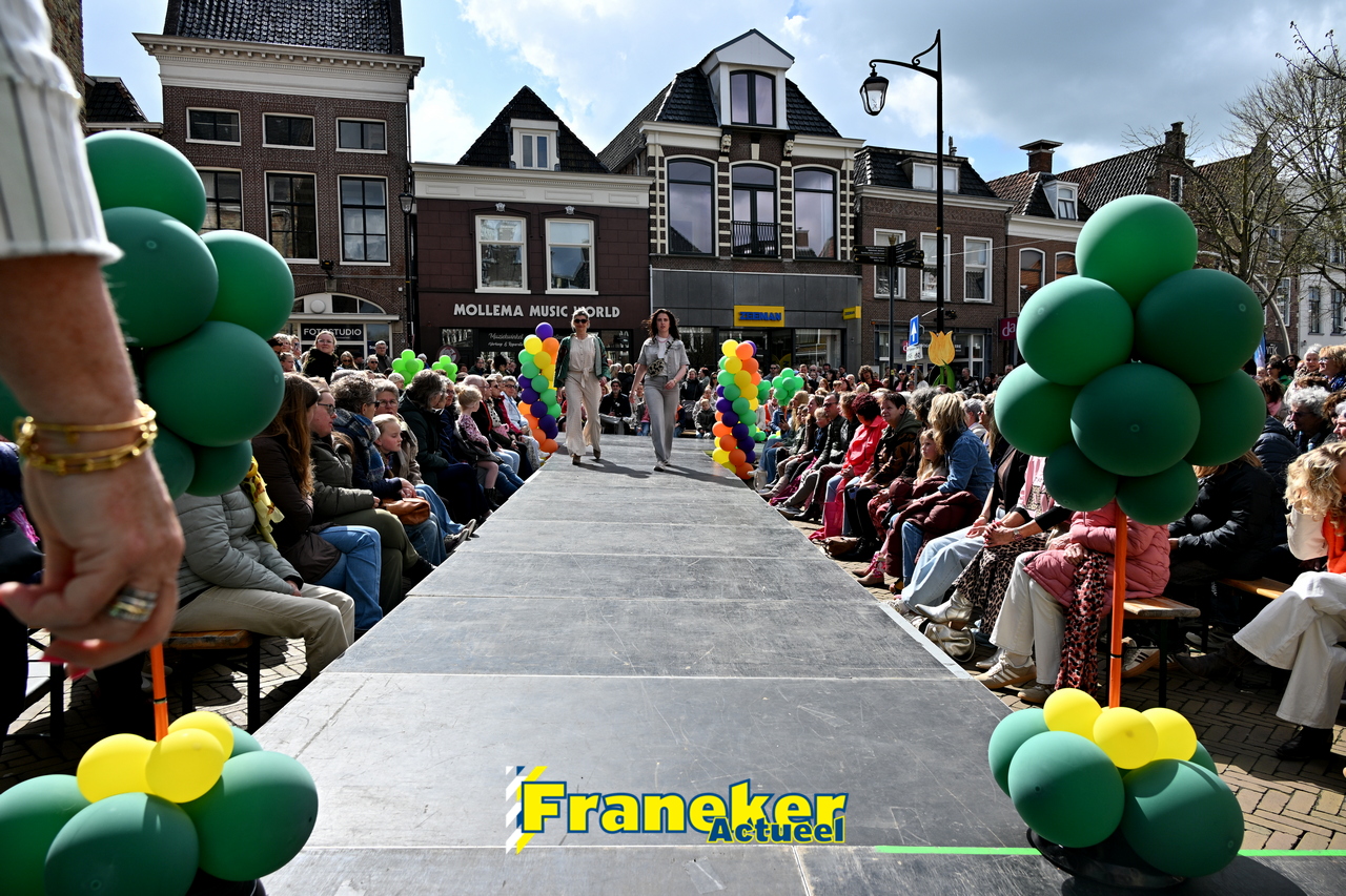 Onder een stralend en regelmatig doorbrekend lentezonnetje vormde het Raadhuisplein in Franeker vanmiddag het kloppende hart van de modewereld. Want op zondag 12 april vond de langverwachte modeshow van het Fashion Weekend weer plaats en de opkomst was groots.